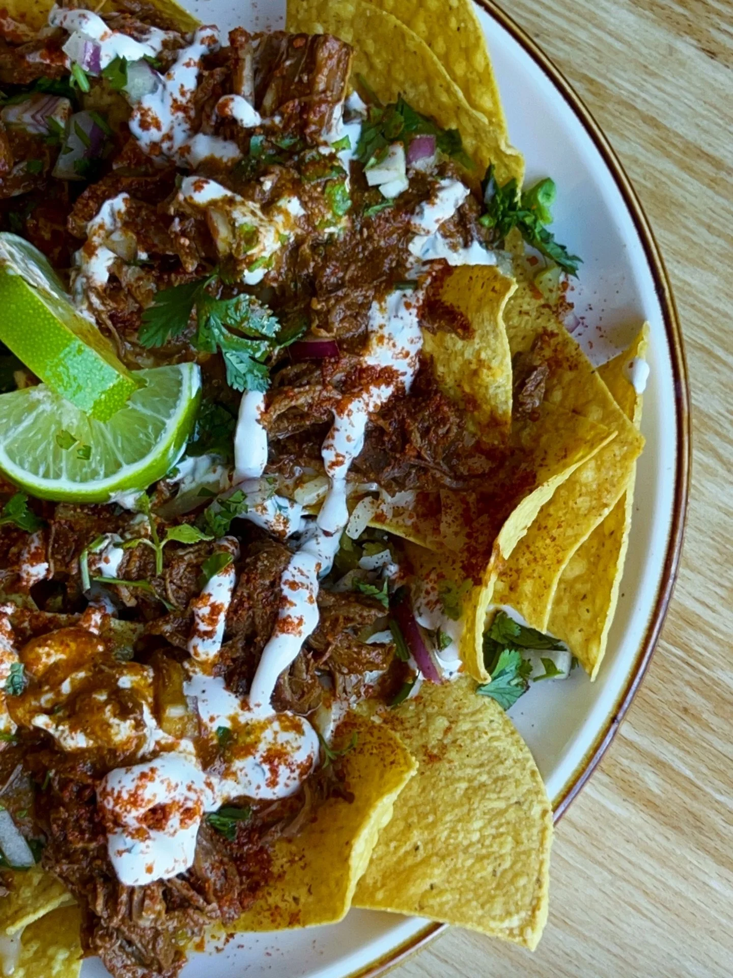 Chili-braised beef, white queso, chihuahua cheese, cilantro, red onions, cilantro sour cream