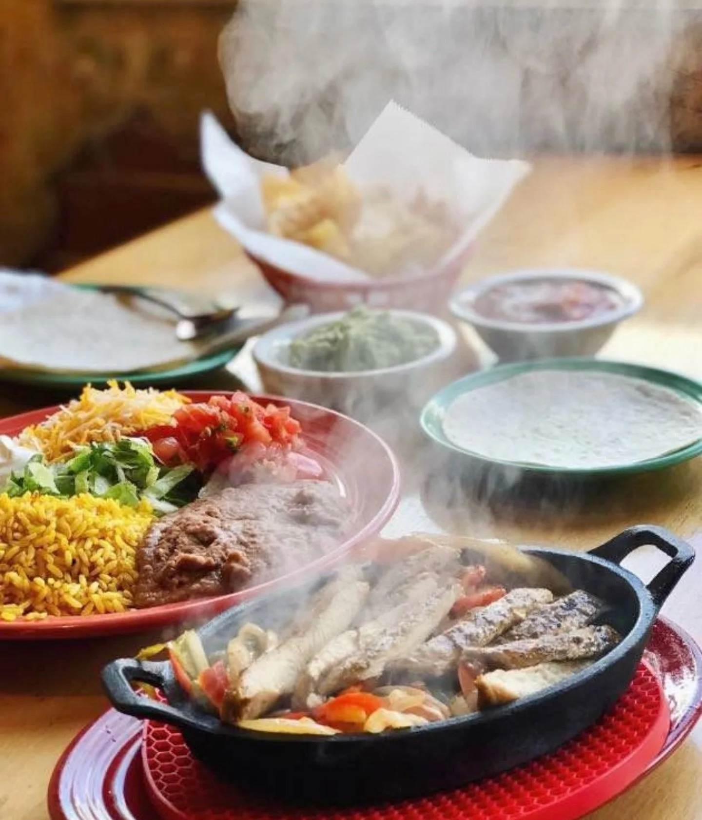 Sizzling Skirt Steak & Chicken, peppers, onions, refried beans, rice, pico, warm flour tortillas